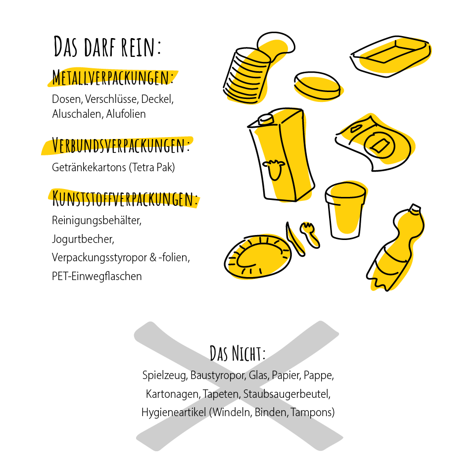 ... können alle im Gelben Sack/der Gelben Tonne entsorgt werden. Generell ist es aber nicht sinnvoll, alles, was aus Plastik ist, im Gelben Sack zu entsorgen. Was nicht recycelt werden kann, sollte auch nicht über den Gelben Sack in den Müll wandern. Das bedeutet nur Mehraufwand für die Sortiermaschinen. Als Faustregel kannst du dir merken: Verpackungen kommen in den Gelben Sack, Produkte nicht. Als Beispiel: Den Vorderteil der Zahnbürstenverpackung, der in der Regel aus Plastik ist, kannst Du in den Gelben Sack werfen, die Zahnbürste selbst nicht – obwohl sie aus Plastik ist. Aluminium gehört immer in die Gelbe Wertstofftonne, weil es super recycelt werden kann. Also auch die zusammengeknüllte, benutzte Alufolie und die Schale vom Grillen. - Trenne Verbundstoffe,...