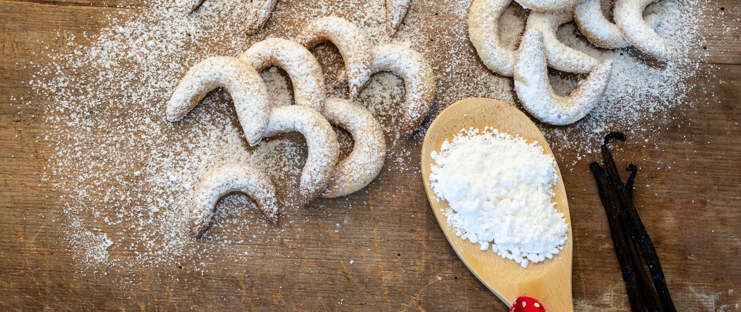 3 Minuten auskühlen lassen und anschließend in der vorbereiteten Puderzuckermischung wenden. Hier muss man den richtigen Moment erwischen, denn wenn die Kipferl zu warm sind, zerbrechen sie sehr leicht und wenn sie zu kalt sind haftet der Puderzucker nicht mehr gut an ihnen.