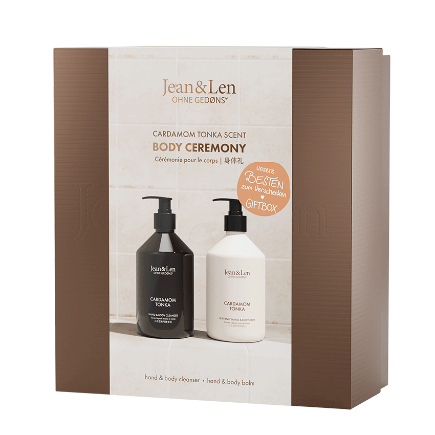 Verschenke zauberhafte Pflegemomente mit der Body Ceremony Cardamom/Tonka. Das Geschenkset enthält den hochwertigen Hand & Body Cleanser und den pflegenden Hand & Body Balm in der sanft-würzigen Duftkreation von Cardamom/Tonka.