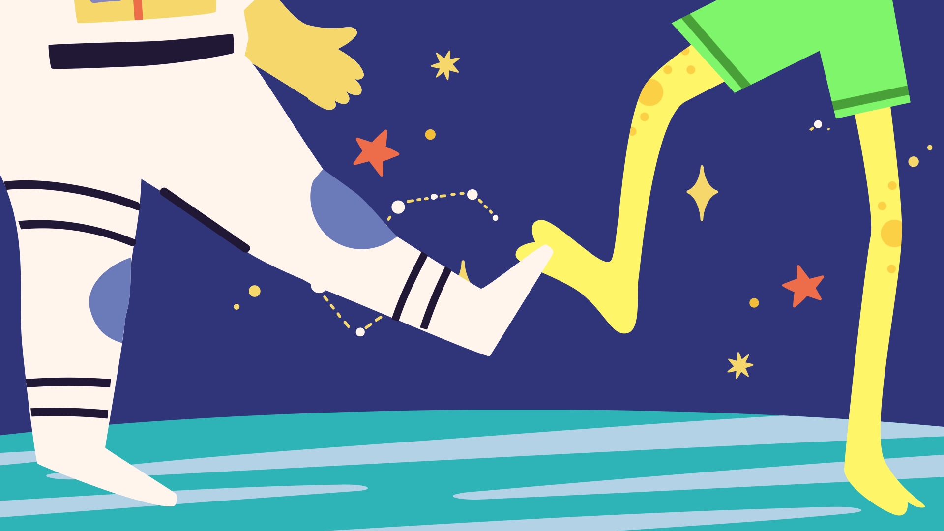 Gekonnt drückte er einige Tasten neben der Raumschiff-Tür, welche sich daraufhin langsam öffnete. Als er herauslugte traute Max seinen Augen kaum, denn neben seinem Raumschiff war ein riesiges Ufo gelandet. Am Bauch des Ufos war eine Treppe ausgefahren über die unzählig verschieden aussehenden Männchen ausströmten: Es waren tatsächlich Aliens! Der kleine Astronaut war aufgeregt und stand wie angewurzelt vor seinem Raumschiff. Einer der Aliens erreichte das Raumschiff am ehesten. Zur Begrüßung streckte er seinen zitronengelben Fuß in Richtung von Max’ Raumstiefel und stellte sich als Flitzo vor. Er war groß, hatte sehr lange, dünne Beine und eine Art Antenne auf dem Kopf.