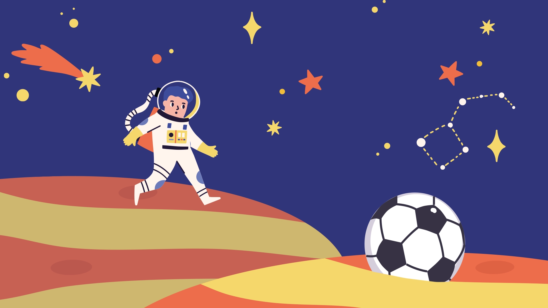 Nachdem er sein Raumschiff in einem der riesigen Krater geparkt hatte, beschloss Max, sich voller Abenteuerlust auf seine erste Mission zu begeben. Er schlüpfte in seinen leuchtend weißen Raumanzug, setzte sich den Helm auf, der Max immer schon an ein Goldfischglas erinnert hatte, und startete seinen Weltraumspaziergang. Weit und breit nur rote Gesteinsbrocken und keine Alienseele. Doch was war das? Am Grunde des Abhangs, der vor ihm lag, sah Max etwas, das nicht rot zu sein schien. Hatte er Leben auf dem Mars entdeckt? Mutig – und wissend, dass die Schwerkraft auf dem Mars nicht so stark war wie auf der Erde – sprang er den Abhang hinunter und schwebte langsam in Richtung des unbekannten Objekts. Als er unten angekommen war, schob er mit seinen Raumstiefeln ein paar Steine zur Seite und fand dort einen perfekt aufgepumpten schwarz-weißen Fußball. Dieser hatte ein knallblaues Emblem auf einem seiner Flicken: 1. Galaxie-Cup. Max’ Augen funkelten vor Freude, denn er hatte schon einmal vom Galaxie-Cup, dem größten Fußballturnier des Weltalls, gehört. Max packte sofort das Fußball-Fieber. Er wollte unbedingt an diesem Wettbewerb teilnehmen!